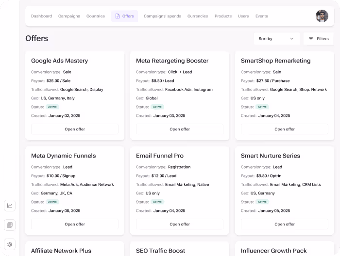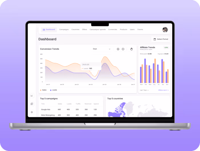High-volume platform for rule-based traffic routing and real-time postbacks, unifying rich analytics with granular controls. Built-in anti-fraud and deduplication protect attribution and keep reporting fast and reliable at scale.