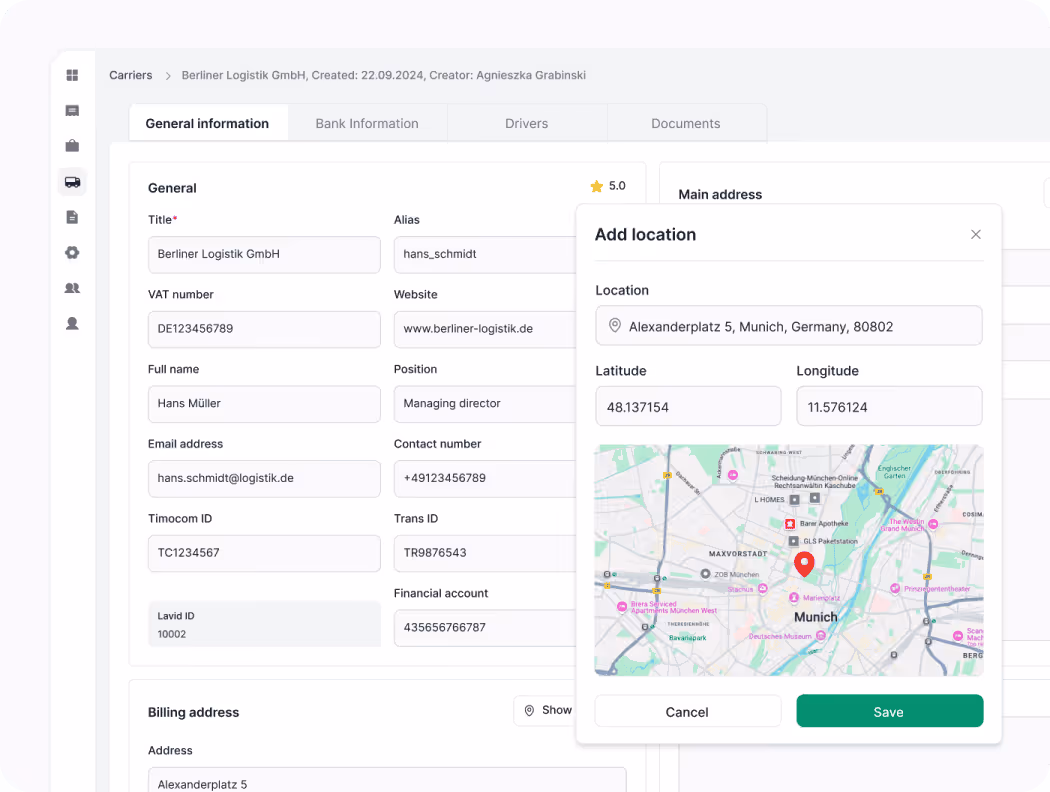 A unified platform for logistics operations with route optimization and driver coordination. Live order tracking with statuses, cargo details, automated cost calculation, and real-time alerts for delays or exceptions.
